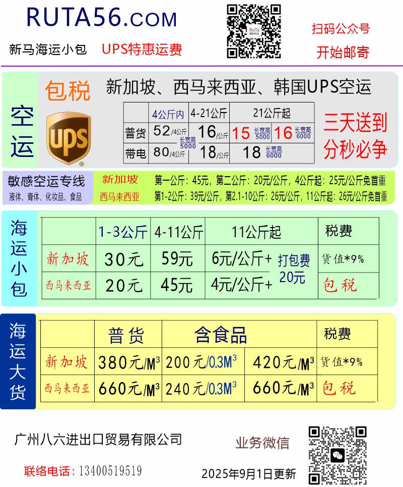 周一下午打包完毕,周二出UPS单号,普货周三新加坡收到货,带电敏感货周四到新加坡新加坡,最多延误一个工作日。